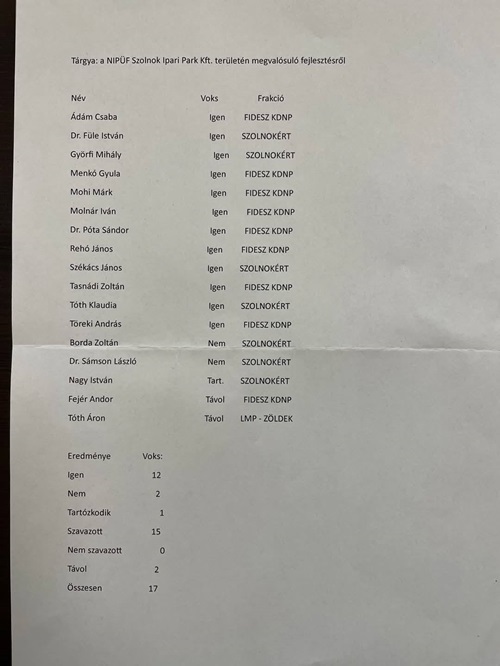Györfi Mihály azt állította, nem volt tudomása a beruházásról, míg a Fidesz képviselői ezzel ellentétes információkat hoztak nyilvánosságra. Az online közösségi felületeken meg is osztották a tavaly novemberben tartott zárt ülés részleteit, amiből az derült ki, az egész közgyűlésből mindössze egy tartózkodó és két nem szavazattal, 12 igen mellett döntöttek a NIPÜF Szolnok Ipari Park Kft. területén megvalósuló fejlesztésről. A polgármester és a jelen lévő összes fideszes képviselő nevét adta az elvi hozzájáruláshoz.