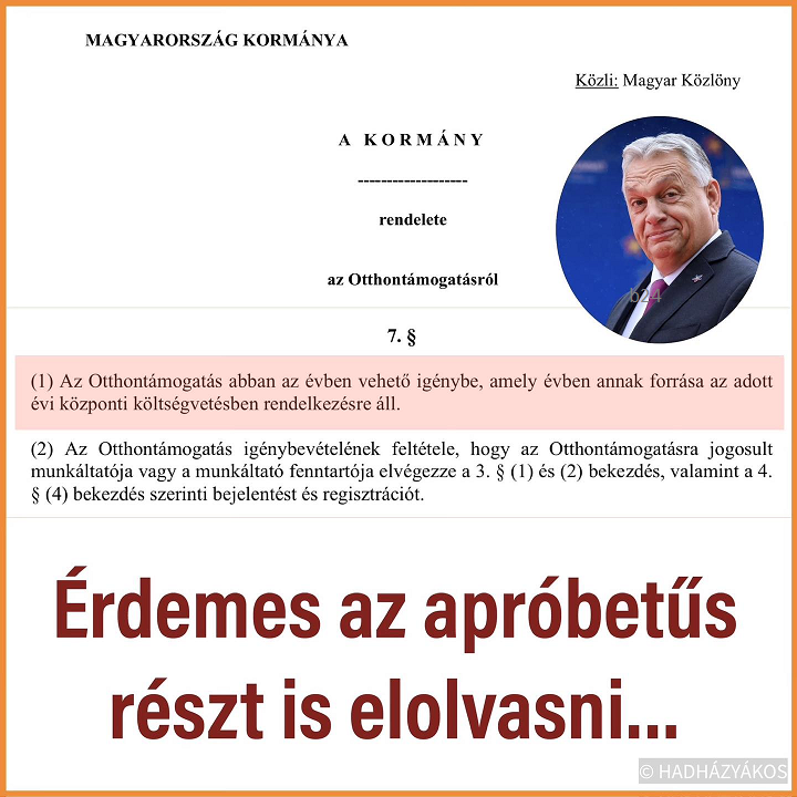 A független képviselő beetetésnek tartja, hogy évi egymillió forintos támogatásként adja el a Fidesz ezt az újabb kampányígéretet így, választások előtt. Mert ha valaki tüzetesen végigolvassa a hetedik paragrafust is, láthatóvá válik a trükk, hogy ez bizony bármikor visszavonható. Erre hívja fel a figyelmet Hadházy Ákos közösségi médiás bejegyzésében.