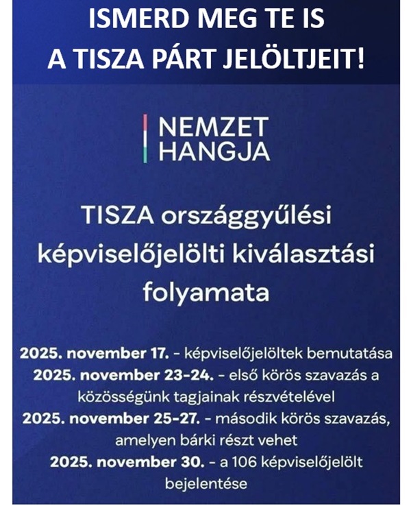 A második fordulót november 25. és 27. között rendezik meg, és ez már nyitott, azaz minden helyi lakos szavazhat, mégpedig a Nemzet Hangja online felületén. A voksolás lezárása után a Tisza Párt elnöksége hagyja jóvá a győzteseket. Az elnökségnek joga van az eredményt felülvizsgálni, sőt vétózni is, ha úgy ítélik meg, hogy a továbbjutó jelölt alkalmatlan lenne, vagy olyan körülmény derül ki róla, amely veszélyeztetné a választási siker esélyét.