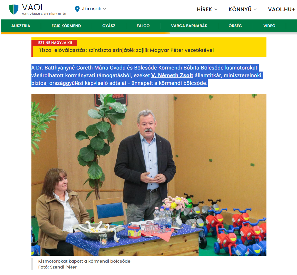 A Dr. Batthyányné Coreth Mária Óvoda és Bölcsőde Körmendi Bóbita Bölcsőde kismotorokat vásárolhatott kormányzati támogatásból, ezeket V. Németh Zsolt államtitkár, miniszterelnöki biztos, országgyűlési képviselő adta át – ünnepelt a körmendi bölcsőde.”