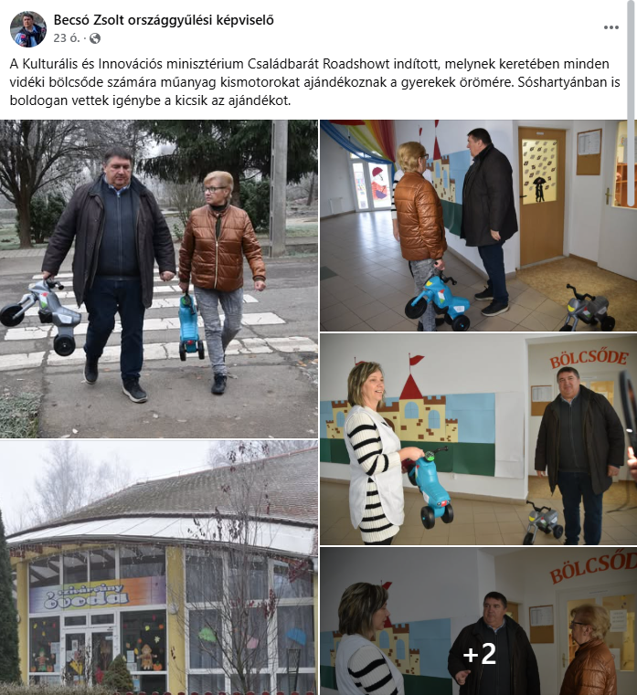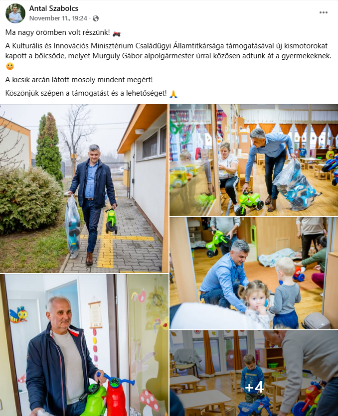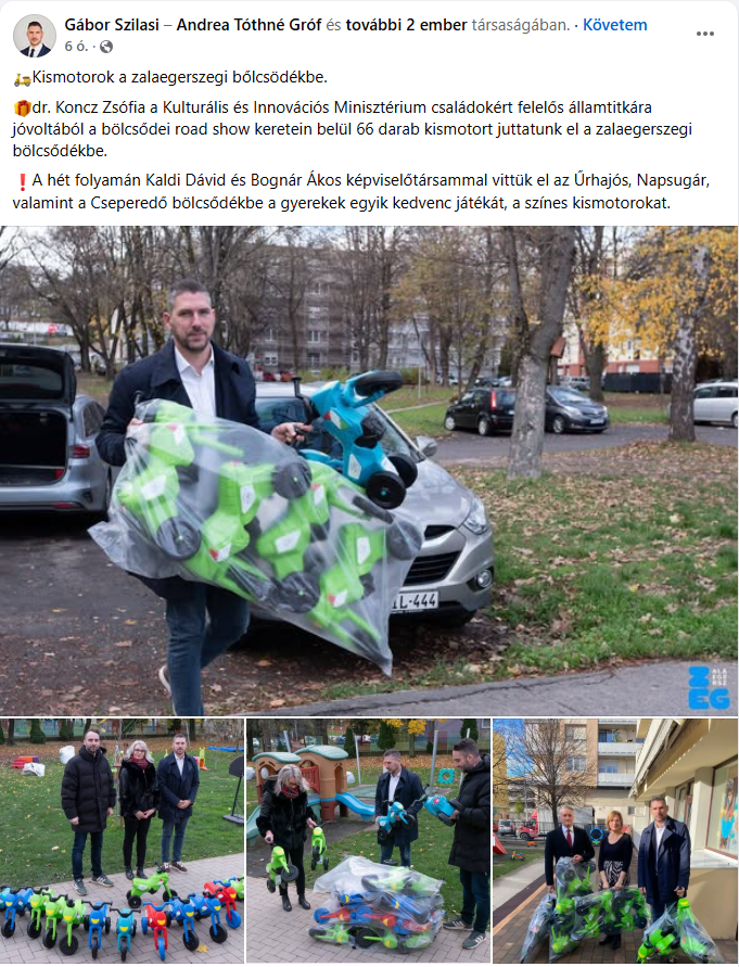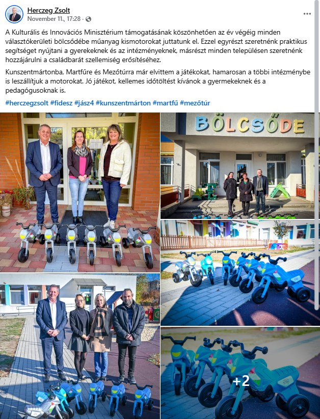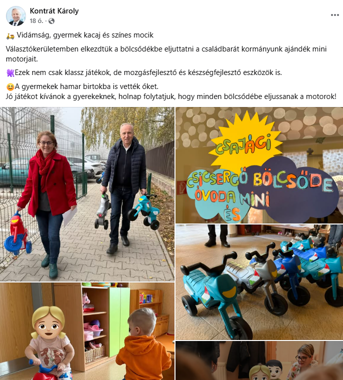 A 444.hu vette észre az újabb hatalmas véletlent, ami kampányidőszakban a Fidesz háza táján történt másfél héttel ezelőtt. Koncz Zsófia és Herczeg Zsolt bejegyzését már korábban is láthattuk, ám mostanra kiderült, hogy itt egyáltalán nem egy-kétszeri alkalomról volt szó, ugyanaz a recept, központi utasításra. Véletlenül mindenhol kormánypárti képviselő-jelöltek adták át az állam által megvásárolt kis műanyag motorokat a bölcsiseknek.