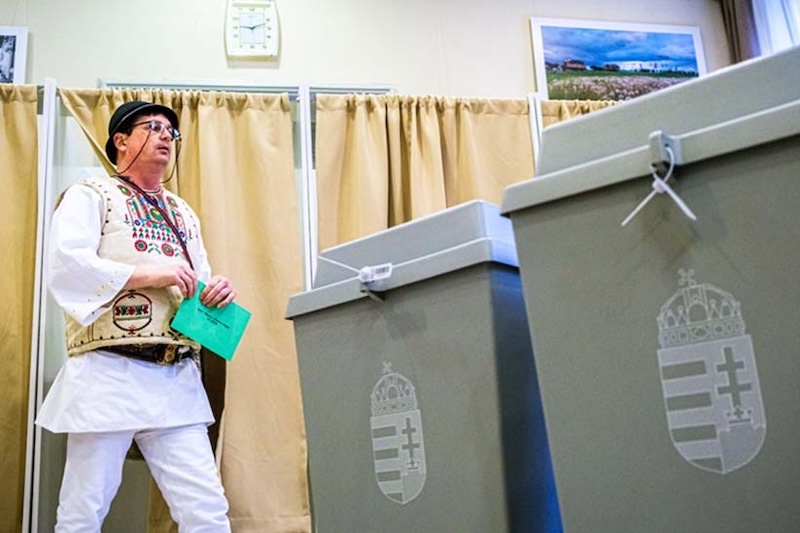 Csíkszereda, 2022. április 3. Leadja szavazatát egy csángó népviseletbe öltözött férfi a magyarországi országgyűlési választáson és gyermekvédelmi népszavazáson Magyarország csíkszeredai főkonzulátusán 2022. április 3-án. MTI/Veres Nándor