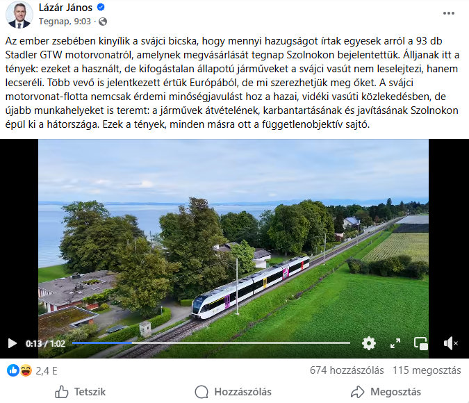 “A Stadler szolnoki üzemében készül a 11 új motorvonat, kollégáim pedig éjt nappallá téve dolgoznak azon, hogy megújítsuk, és nagyságrendekkel kényelmesebbé tegyük a magyarországi kötött pályás járműállományunkat” – írja Lázár János Facebook-bejegyzésében.