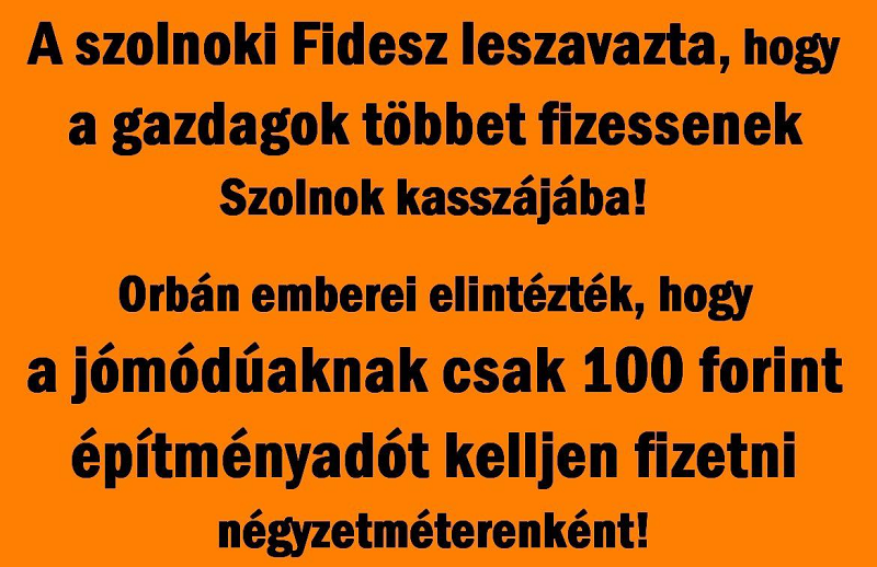 Ezzel szemben Györfi Mihály arra mutat rá, csak a nagyon gazdagok számára lett volna plusz kiadás a változtatás, így viszont a több százmilliós vagyonnal és több hatalmas ingatlannal rendelkező ultragazdagok is pontosan olyan kedvezményes, szinte jelképes összeget fizetnek, mint a szegényebbek. “A szolnoki Fidesz leszavazta, hogy a gazdagok többet fizessenek Szolnok kasszájába! Orbán emberei elintézték, hogy a jómódúaknak csak 100 forint építményadót kelljen fizetni négyzetméterenként! Ki választotta meg őket?!” – fogalmazott a szolnoki polgármester. Ezt a következő képpel illusztrálta: