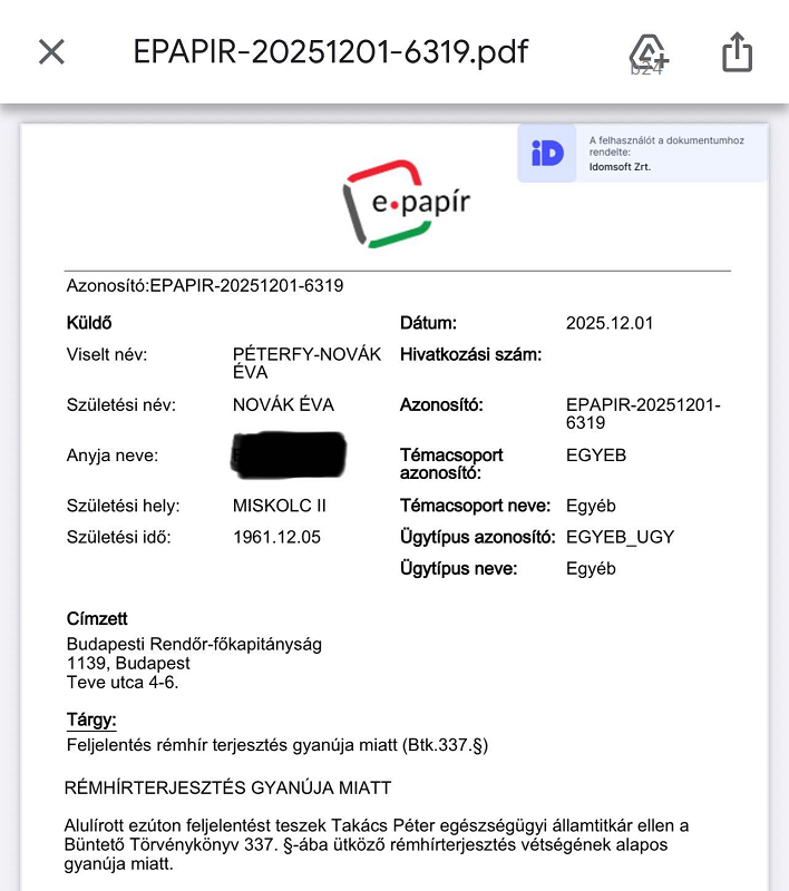 Alulírott ezúton feljelentést teszek Takács Péter ellen a Büntető Törvénykönyv 337. §-ába ütköző rémhírterjesztés vétségének alapos gyanúja miatt.