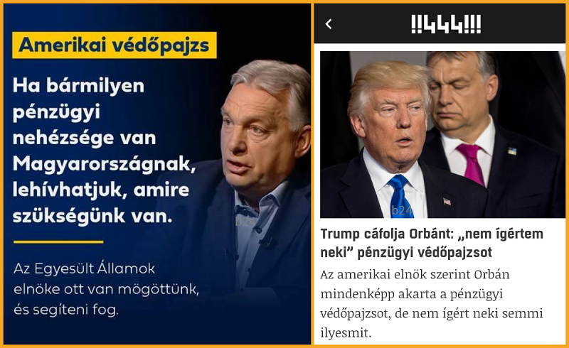 “Orbán a Magyarországnak ígért amerikai „pénzügyi védőpajzs”-ról azt mondta, akkor hívjuk le, amikor akarjuk, és olyan formában, ahogyan akarjuk, csak előtte még tárgyalni kell erről Trumppal. Konkrét összeget ezúttal sem mondott, de úgy fogalmazott: 10-20 milliárd dollár az az összeg, ami a magyar gazdaság stabilitásához szükséges, Amerikából nézve pedig ez nem nagy összeg.”
