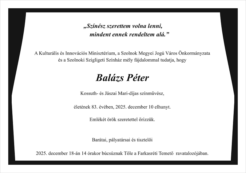 “Csendes főhajtással szeretnénk tudatni kedves nézőinkkel, hogy Balázs Péter, színházunk egykori igazgatója, Kossuth- és Jászai Mari-díjas színművész búcsúztatására 2025. december 18-án (csütörtökön) 14 órakor, a Farkasréti Temető ravatalozójában kerül sor.