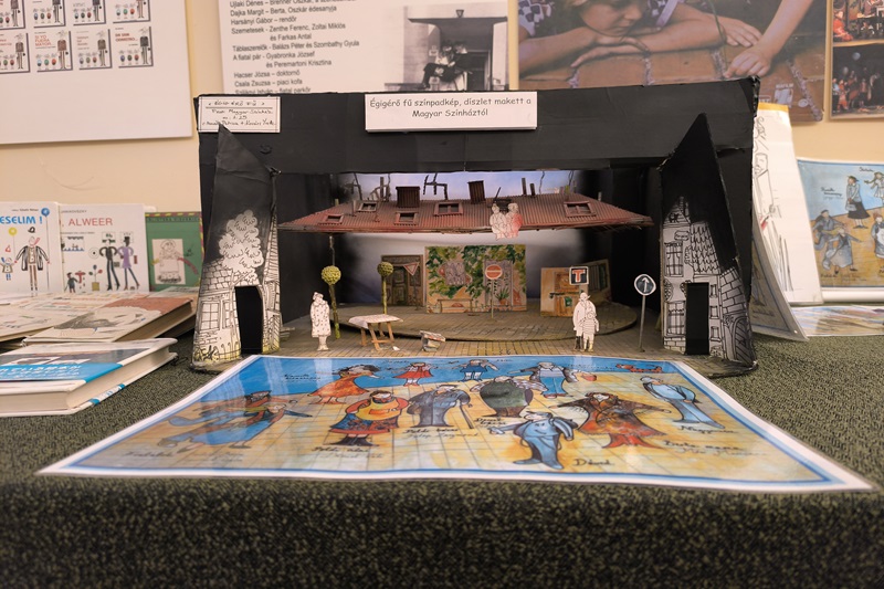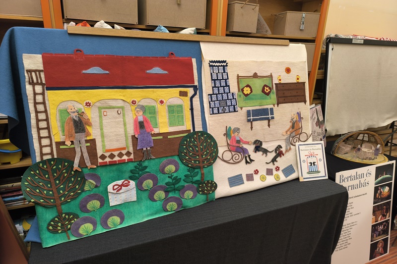 A tárlat egyik hangsúlyos részében a Bertalan és Barnabás világához kapcsolódó, a könyvtár együttmúködésében készült bábelőadás kellékei, jelmeztervei és makettjei láthatók.