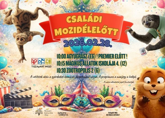 Családi mozidélelőtt a TISZApART-on: A mozi a legkisebbekre is gondol: február 28-án (szombaton) 10 órától családi mozidélelőttel készülnek, ahol három párhuzamos vetítés várja a gyerekeket: