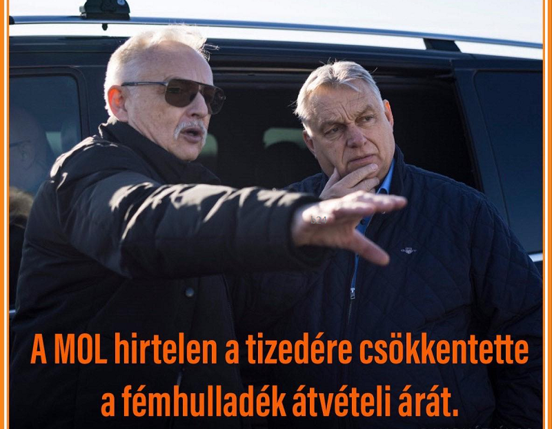 Az történt, hogy amióta a MOL a teljes magyar hulladékvagyonra rátette a mocskos kezét, minden hónapban megküldi a vele szerződésben álló, fémhulladékot gyűjtő partnereinek, hogy mennyit fizethetnek a behozott anyagért. A márciusban kiküldött dokumentumokban azonban az áll, hogy ezentúl a februári áraknak csak a tizedét kaphatják a fémhulladékot kibocsátó vállalkozások vagy a hulladékot apránként összegyűjtő, általában kifejezetten szegény emberek. A hulladékgyűjtő vállalkozások is a csődtől tartanak, mert szerintük ezentúl a nagyobb kibocsátók külföldön adják majd el az értékes hulladékot.”