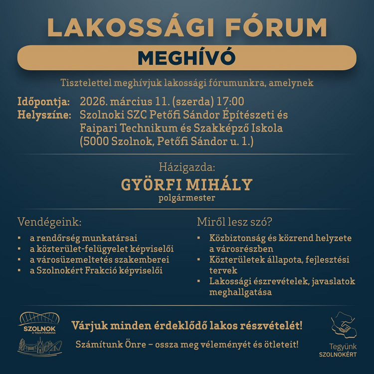 “Jöjjenek el közbiztonsági fórumunkra, amit március 11-én, szerdán 17 órától tartunk a Szolnoki SZC Petőfi Sándor Technikum és Szakképző Iskolában (5000 Szolnok, Petőfi u. 1.).