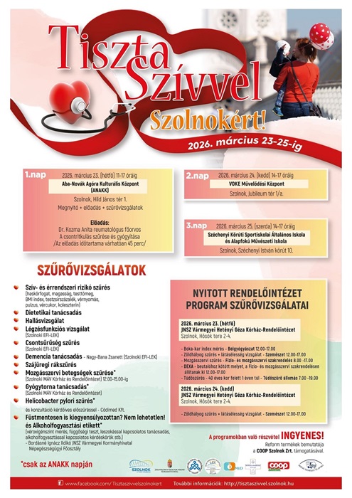 A megelőzés jegyében idén is elindul a „Tiszta Szívvel Szolnokért” egészségmegőrző kampány, március 23. és 25. között térítésmentes vizsgálatokat vehetünk igénybe a város több pontján. A helyi lakosok kényelmesen, sorban állás nélkül juthatnak hozzá olyan alapvető ellenőrzésekhez, amelyek kulcsfontosságúak a betegségek korai felismerésében.