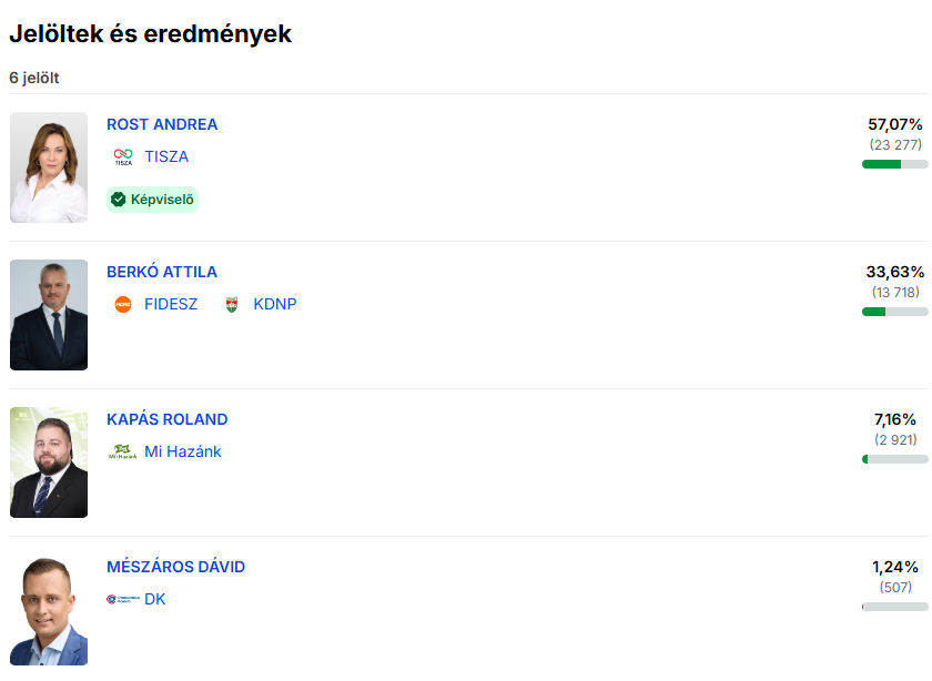 A szolnoki, 1-es számú választókerületben Rost Andrea fölényes győzelmet aratott. A Tisza Párt jelöltje közel 58 százalékot szerzett, miközben a Fidesz–KDNP jelöltje, Berkó Attila bőven tíz százalékpont feletti hátrányba került.