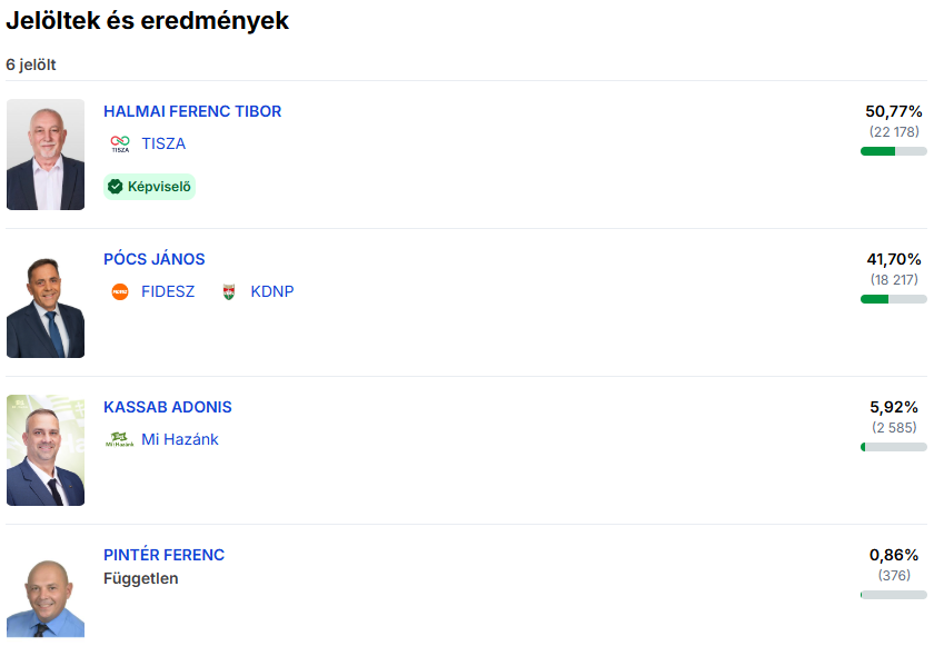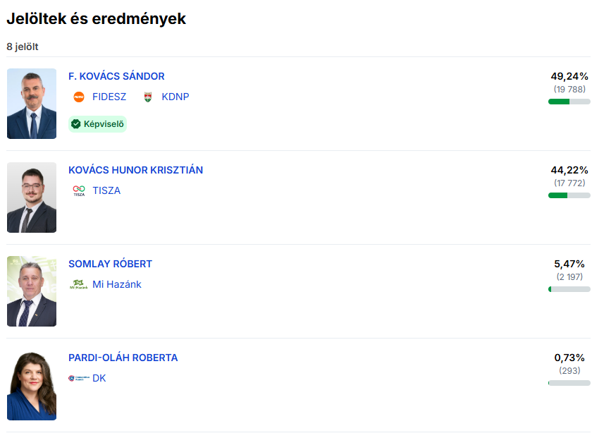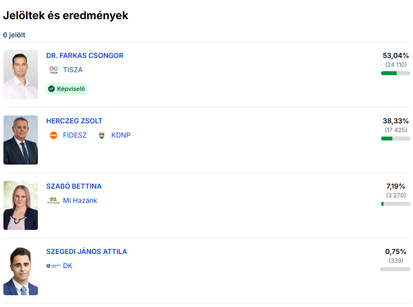 A törökszentmiklósi, 4-es körzetben ismét egyértelműbb volt a kép. Dr. Farkas Csongor több mint 53 százalékos eredménnyel győzött, megelőzve Herczeg Zsoltot. Itt a különbség már nem hagy sok teret értelmezésre. A választók láthatóan nyitottak voltak egy új szereplőre, és a kampány során hangsúlyozott helyi problémák – különösen a megélhetés és a közszolgáltatások állapota – erősen hatottak.