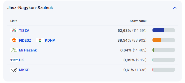 Itt összesen 369 szavazókört kellett megszervezni, felügyelni, majd eredményeiket megszámlálni. Az érvényes szavazólapok száma 217 727, ami annyit jelent, hogy az 1 793 érvénytelen mélyen az 1% alatt maradt. Az eredmény pedig a fenti ábrán olvasható, 52,63%-os eredményt ért el a Tisza Párt, míg a Fidesznek meg kellett elégednie a 38,54%-kal, ami nagyjából az országos átlag. A DK itt még az 1%-ot sem érte el. Jász-Nagykun-Szolnok megye négy körzetéből hármat vitt el a Tisza és egyetlen egyet a Fidesz, bukott Pócs János is.